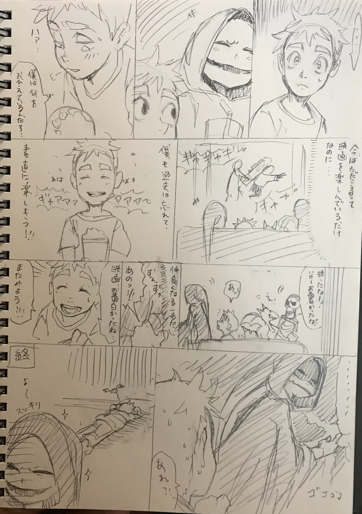 いぎたい グーリーズ 2019年03月23日 0 こんにちは、ゆめこです。久々の更新・・そして、以前の記事に拍手して下さった方々ありがとうございました…!サイトの改装はもう少しだけお待ちください。といっても全然変わってませんけど!今使ってるサービスのWixの仕様、最初は便利だな〜と思ってたけど、使っている内に不便な所や、こうしたいという事が気軽にできなくて…。例えばギャラリー。1枚のページに複数枚の投稿が出来ないところが残念だなと。それで色々と他のサービスも試してみたりして…なんとか妥協点は見いだせたかな?という感じです(´・ω・)あと今回のギャラリーで載せたい絵が…!年始で実家帰った時に整理して出てきたUSBに、昔の昔に描いたイラストのデータが少し入ってたので、それも載せたいなと。めちゃくちゃ懐かしいやつが出てきてですね、こんなの描いてたな〜と感慨深いものがありました。自分もいつこの世からいなくなるかわからないので、記念に載せようと思います(南海〇〇○がきたら確実にヤバイ)さぁ、今の内にやりたい事を消化していくぞ〜、そのやりたい事がどんどん増えていったりするんですけどね・・!笑そんでもって以下、やりたい事でグーリーズ の漫画です(^ω^)殴り書き漫画なので絵も文字も雑いし汚いぞー!!前置きとして、時系列はバロンを懲らしめた後で、一体何をどうしてかはわかりませんが、クーパーもグーリー達も仲良くなっています。誰が何を言おうとも仲良くなっています。内容はいつもの…リーパーさんが出るやつです。 みんなで映画鑑賞の巻 いつものクーパーいじめですよーー!!!!!クーパーはグーリー達とはお調子者同士なので仲良くなりそう、なってたらいいなという妄想・・でもクーパーとリーパーが仲良くなる事はまず無いという。リーパーさんは普段怖いけど、身内同士になると結構お茶目だったりするんです。だがしかし、クーパーには厳しいタイプ。クーパーには絶対に心を開かないし、そもそもクーパーが調子に乗ってるのが気に入らないので、虐げて痛い目に合わせると満足するというサディスティックなやつです。そしてアンバーと馬が合う。アンバーもクーパーを虐げたいと思ってるから…( ˘ω˘ ) [2回]PR