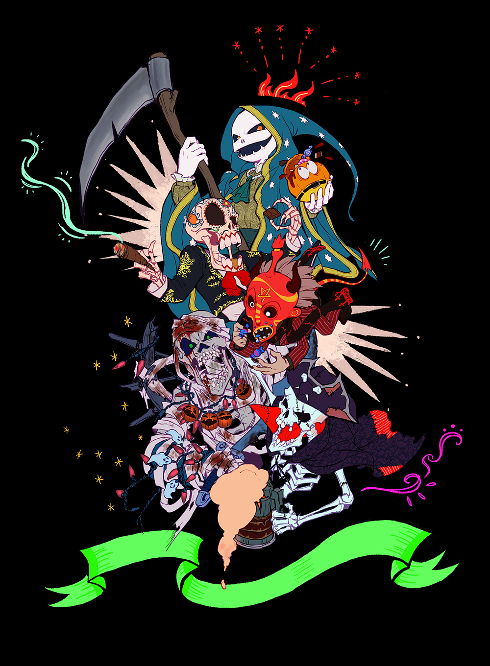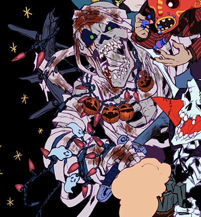 ハロウィン2018 レア社 2018年11月07日 0 ハロウィンは過ぎて世間はもうクリスマスムード…にも関わらず、ハロウィン絵を描きました(^ω^)ハロウィンというレアにぴったりのイベントかつ、合法的にキャラに仮装させてもよい日…時期が過ぎたとかは関係ありません!(前もって描いときなさい 今年はレア社のドクロ系と死神系のキャラを。他にもドクロキャラいますが、いつもの好みの人選です笑ハロウィンイラストなのでホラー系の音楽を聴きながら絵を描くのですが、これがもう最高に楽しくて。世間は子供達のイベントやパリピのゲリラ的ハロウィンと色々と盛り上がっていましたが、私はオタクハロウィンで盛り上がっていました…(..◜ᴗ◝..) こちらは影を抜いた版です。影塗ってない方がいいかも…メンツはグーリーズのリーパーさんとコンカーのグレッグ、ピニャータのダスタードスにKIのスパイナルそしてSea of thievesのガイコツです〜。 フードを被ってないので、誰だかわかりませんがグレッグです...!!グレッグはメキシコのカラベラのようにしたかったのでメイクアップやら伝統衣装やら着させました( ´ ▽ ` )葉巻も似合いそうなので持たせてみたり。 リーパーさんはどんな格好させようか悩みました!笑フードもアイデンティティーの一つなのではずしたくない上、どの仮装だったら自分がもえそうか…とか考えながら…_:(´ཀ`」 ∠):で、グレッグのメキシコ関連でサンタムエルテという死の聖母イメージ仮装でフードとローブを掛け合わせて見ました。長い布いいですよね…またもや趣味丸出し ダスタードスはもともとピニャータ自体がメキシコ風のデザインなのであえて正統派っぽいハロウィン衣装を!と思いまして、悪魔ぽい仮装を。ダスタードスに角を生やしたら、バフォメットぽくなっていい感じにおさまった気がする。 スパイナルはゾンビです〜。そしてゴチャゴチャした飾り付け。なんか動き回っている内に電飾とかが絡まってしまったみたいな。スパイナルの仮装は適当そう…、本人自体仮装というものを理解してなさそうな…。 最後はSea of thievesからガイコツ!適当にハロウィンぽいマントつけてますww今回のイラストをツイッターで上げたら、あのレア社キャラの生みの親、Steve Maylesさんからコメントを頂きましてもうめっちゃ嬉しかったです…!社員にしてくれーー!!!!ツイッターって本当、どこでどう人と繋がるかわかりませんね。日本にもこんなファンがいるよという、存在を知ってもらえたら嬉しい…。そして社員に(しつこいーーーーーーーーーーーーーーーーーーー前回の記事に拍手をしてくださった方々、ありがとうございました!励みになります…。実は先週で数年間配属されたチームを抜けたので、2週間ほど休暇をいただきました!自分の有給を使っての休暇ですけれどもw盆休みの分も含めて楽しみます〜。積みゲー消化したり趣味のことをやったりしたい..! [5回]