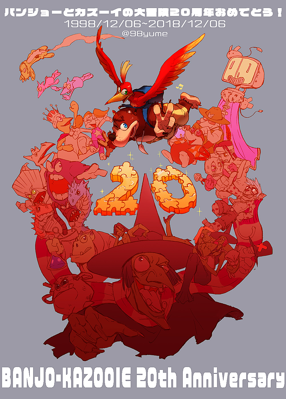 バンカズ20周年おめでとう!!! バンカズ 2018年12月06日 0 バンジョーとカズーイの大冒険20周年おめでとうございます!!!日本では12月6日がバンカズの発売日でしたので、この日が日本でのバンカズ20周年記念日ですね。20周年のお祝いなので上のイラストをかきました。なんとしてでも描きたかった・・!時間の加減で描きたいキャラが全部描けませんでしたし(2のボス描いているのにミンジー抜けている)、焦りすぎて1998を1988と誤植したり・・ツイッターで外国の人から1988?ってツッコミきた時は恥ずかしさでむず痒くなりました笑 焦っていたんですよ! 擬人化のもちゃっかりw10周年記念のイラストを描いたのが10年前とは・・いやはや驚きです。随分と前の事ですが、少しだけ前のようにも感じる。バンカズ2からガレ大が発売される期間の”バンカズ3”を期待していた時の方がとてつもなく長かったような気がいたします。バンカズの発売は12月という季節柄、クリスマスプレゼントで貰ったという方が多いみたいですね。かく言う私もその一人ですが。私はサンタさんのプレゼントでもらいました・・笑今でも鮮明に覚えてますね~。初めてサンタさんに貰ったゲームでしたから。当時は任天堂のゲームが好きで、カービィやポケモン等のかわいいものが好きで。バンカズはCMこそやっていましたけれども、そのお世辞にもかわいいとは言えないビジュアルにあまり興味が沸かず・・プレゼントの袋を開けた時は「え・・?これ??」って思いましたよ。でも新しいゲームというだけですごく嬉しかったので、ありがたかったです。でもまぁとにかく内容がシビア&トラウマだらけで・・!溺れて死んだり、ゲームオーバー画面に異様な程の恐怖心を抱いてましたね。コンプリートできるまでは数年かかりました・・w勇気が出なかったんですね、クランカーで無敵の技が取れずじまいだったので。そして2。兄弟が欲しいって言って買ってもらっていました。1よりも2で大いに嵌りました。会話のシーンも多くなって、全体的に賑やかになってましたし、1のおかげでトラウマにも若干慣れて笑この時に1でかわいいと思ってたカズーイに、本気で好きになったタイミングでもあります・・。CMを見るのに必死でしたね。なんであんなに好きになっていたんだろう・・w感受性の豊かな時期だったなと思います。こんな過去形で語ってますが、今でも好きですよ!ただ、以前の時のように新作を懇願する事も、飢えすぎて胸が苦しくなる事もなくなりました。本当に当時は狂っていた。レア社に嵌ったのも好きな物やゲームも全部バンカズがあったからだったりするので・・今でこそ当時よりかは落ち着いていますが、正統な続編とスマブラの参戦も心の片隅で願っています・・。あと、スマブラのダックハントがもろにバンカズすぎて「これは獣タッグ系を出しておいて、バンカズ枠を潰したのか?!」と邪推してしまう。ダックハント出すならバンカズもスマブラ参戦してくれーー!!!今回、バンカズが20周年を迎えたので、この先に何か進展があるかどうかわかりませんが今でもたくさんの人に愛されているシリーズなので今後の活躍に期待しますね。そしてまた10年後の30周年にはどうなっている事か。また30周年を祝えれたらいいですね。 [2回]PR